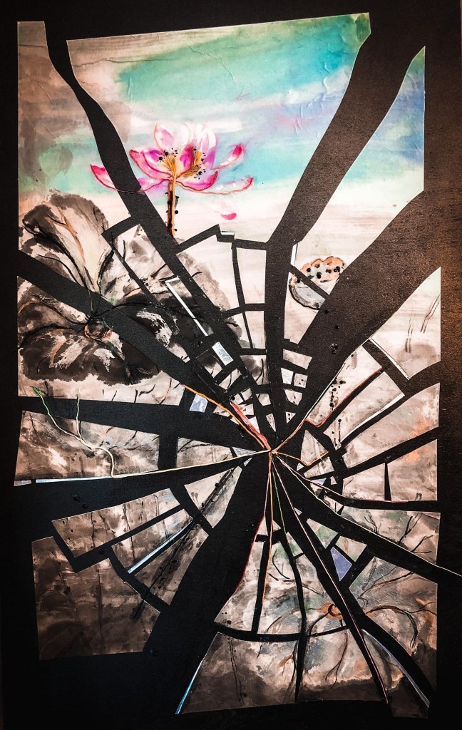 This piece represents my journey as a survivor of sexual assault. The lotus flower symbolizes strength over adversity, as the seed must grow in the mud and up through the water to bloom. Originally created for the Healing Fibers exhibition, then shown in Survivor Expressions, the threads winding together to knit the shattered pieces of the image together and into the flower represent all those people that have supported me in the time since.