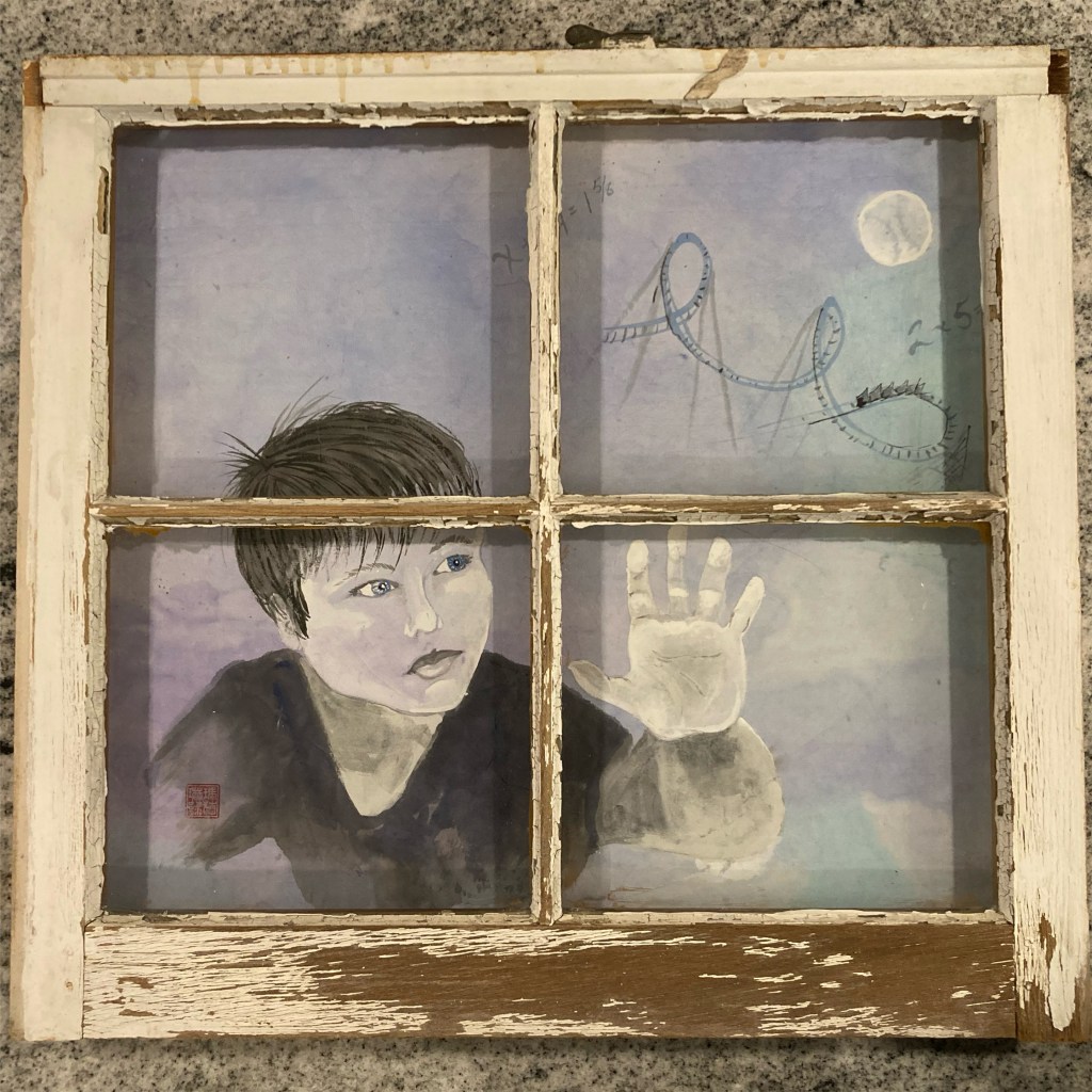 I created this piece for Artsworcester show “Inside Voices”, which encouraged artists to reflect on the experience of the isolation of the pandemic. One of the most profound struggles I’ve experienced is one I know many can relate to – the heartbreak of seeing your children sad as their world shut down, and being powerless as a parent to “make it better”. My son posed for this piece, with rollercoasters, baseball, and school equations in the background locked away while he could only look out the window….