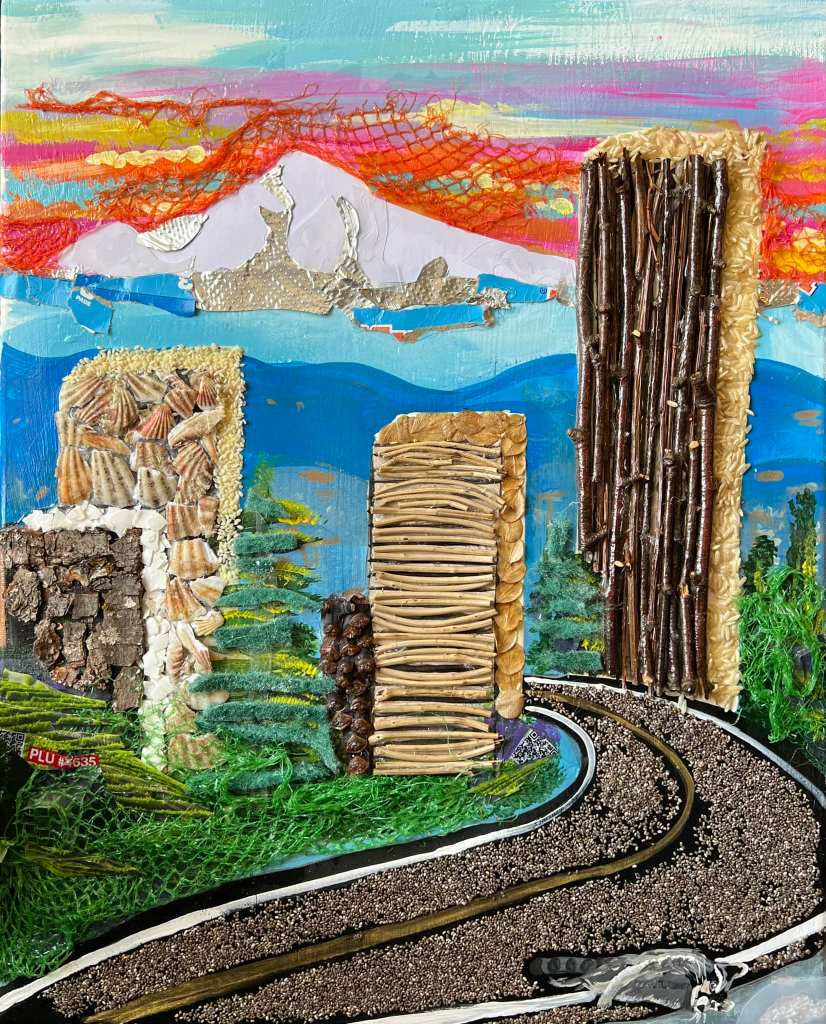 Acrylic and mixed media collage for the ArtsWorcester’s Impact show. This years theme explores man’s relationship to the natural world. This piece is inspired by two of the Fitchburg Art Museums pieces – “Bulldoze Slash, Tillamook Oregon” and “Gulf Piles”. I was born in OR and have family still there. In this piece Mt Hood dominates the Portland skyline, but all natural elements are replaced by trash, where the man made buildings and road are made up of natural materials. Thank you to my cousin Darrell Gossett for providing some images to work from.